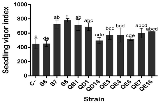Effect of bacterial inoculation on quinoa seedling vigor index. The values represent means of replicates (n = 3) ± standard deviations. The letters in superscript indicate the statistically significant difference at 95% between treatments.