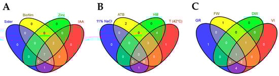 Selected PSB were tested for resistance to antibiotics on TSA agar medium [41]. Plates were prepared by adding various concentrations of antibiotics, namely, ampicillin (100 μg·mL−1), kanamycin (50 μg·mL−1), tetracycline (10 μg·mL−1), streptomycin (100 μg·mL−1), chloramphenicol (20 μg·mL−1), and spectinomycin (60 μg·mL−1). A single colony of each bacterial strain was streaked on these plates and further evaluated for resistance after 24 h of incubation at 30 °C. E. coli DH5α, known for its sensitivity to tested antibiotics, was used as negative control [42].