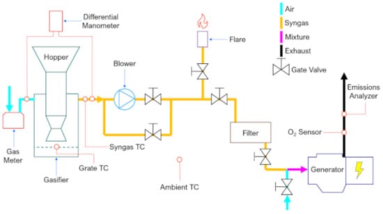 Once the emissions were measured, they were correlated to the absolute amount of exhaust gases released during the combustion in the engine knowing the fuel consumption. After that, the test with syngas was set up adapting the generator to be coupled with the gasifier as described in [22]. A wideband O2 sensor was implemented on the exhaust pipe to manually adjust the fuel/air ratio of the mixture through a gate valve added at the intake manifold. The original air filter was removed and substituted with an Iveco air filter for trucks to preserve the engine from tars and particulate without excessive pressure drop. It is important to prevent an excessive amount of these contaminants from reaching the engine to maintain the operation and endurance of components such as valves, combustion chamber, and pistons [36]. Tar yield depends on the gasifier type [37] and the downdraft reactors produce syngas with a low tar content [38,39] and, therefore, was chosen to implement this very simple filtration stage. The fuel tank was removed from the generator for safety reasons. Four thermocouples were used to measure the following temperature: reactor grate, syngas downstream the reactor, exhaust gas flow, and ambient air. A G4-grade gas totalizer was used to measure the airflow entering the gasifier as a gasifying agent. A differential manometer was used to measure the pressure drop across the reactor. The scheme of the gasifier engine system is depicted in Figure 3.