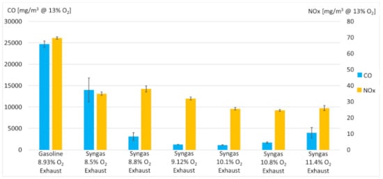 The second outcome is the higher mass and volume flow of the exhaust gas running on gasoline. Therefore, even hypothesizing that the emission concentrations in the exhaust gas were the same, the impact on the environment would be lower running on syngas.