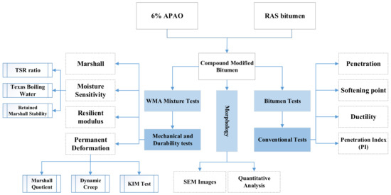 Conventional bitumen tests, including penetration, softening point, and ductility tests, were performed on RAS-modified bitumen. Various mixture tests, including Marshall, moisture sensitivity (indirect tensile strength, retained Marshall stability, and Texas boiling test), resilient modulus, and permanent deformation tests (dynamic creep test and deformation strength rest), were carried out on more than 105 asphalt mix samples to investigate the mechanical and durability properties of asphalt mixtures containing RAS-modified bitumen. Figure 1 shows a scheme of the experiments performed in this study.