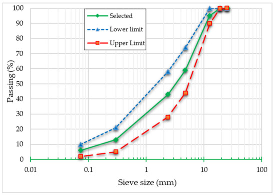Aggregates as the main constituent of asphalt mixtures have an essential effect on its performance, durability, and stability. The aggregates, including filler used in this study, had a calcareous origin (i.e., limestone). The gradation curve of the mixture is shown in Figure 5, which was selected based on Iran Highway Asphalt Paving Code (No. 234) [26].