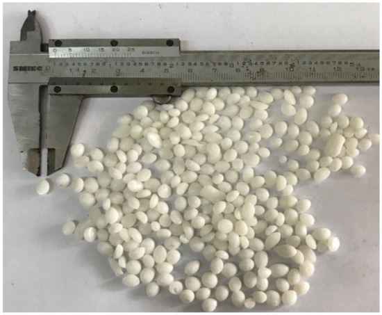 The polymer provided for this study was Evonik Vestoplast® EP-901 with granulated particles. Previous researches evaluated APAO polymer-modified bitumen at 2–8%, 6% of which are in good adaptability with bitumen; thus, 6% of APAO polymer was used in this research work [20,27]. Figure 6 shows this polymer’s appearance, and Table 6 presents its technical properties.