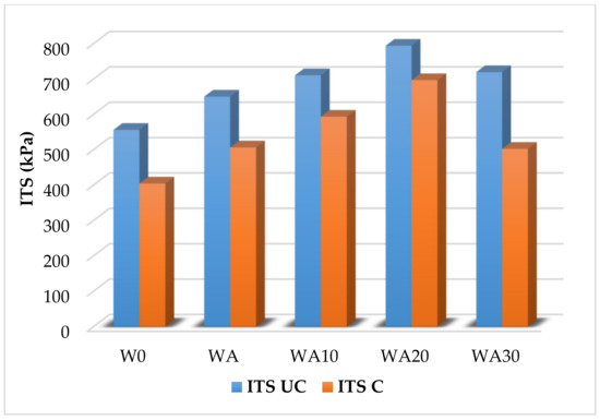 where is the indirect tensile strength (), is the maximum load (), is the sample thickness (), and is the sample diameter (). The tensile strength ratio () (Equation (2)) was applied to examine moisture susceptibility of asphalt mixtures with a TSR threshold of 0.8.