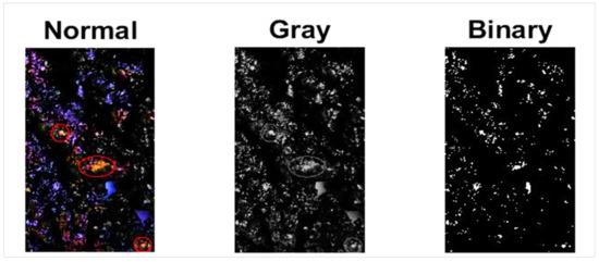 To have a precise analysis of this test, colored photos were rendered in black and white with a pixel range of 0–225, using MATLAB software. Figure 16 shows colored, black-white, and binary images related to one of the boiling water test specimens in which black and white areas refer to the coated and uncoated parts of the aggregates with bitumen, respectively.