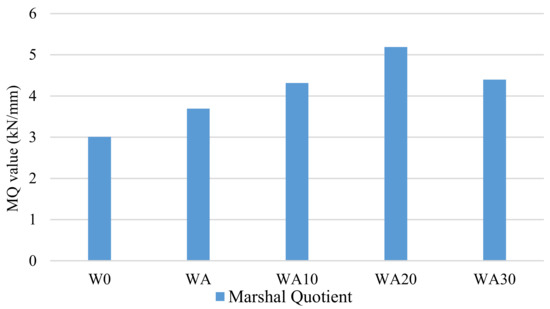 Marshall Quotient (MQ) is the Marshall stability ratio to the Marshall flow of asphalt mixtures. The higher the MQ value of a mix, the higher the stiffness and resistance to deformation and, subsequently, higher resistance to rutting [40,41,42].