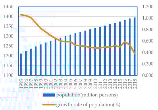 Figure 1 shows the changes in China’s population from 1995 to 2018. In terms of the population size, the natural growth rate of China’s population is subject to domestic family planning policy. It reached 1.060% in 1995 and has been declining since 1995. In 2006, it dropped to 0.529%. From 2006 to 2015, it has been in a stable state, the growth rate fluctuated between 0.497% to 0.529%. After reaching a peak in 2016, it began to decline. Although the natural growth rate has shown a downward trend in the past 24 years, the average annual net increase is about 7.674 million persons.