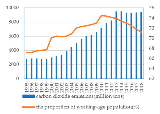 The trend of carbon dioxide emissions and the proportion of the working-age population.