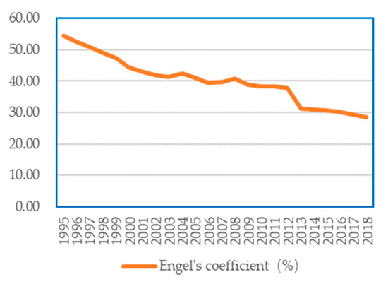 Figure 3 describes the changing trend of the Engel coefficient from 1995 to 2018. Engel coefficient refers to the ratio of food expenditure to total consumption expenditure, which reflects the consumption structure of residents. The lower the coefficient is, the less the residents spend on food and the higher their living standards are. From 1995, the Engel coefficient has been decreasing year by year, which showed that China’s economy increased year by year.