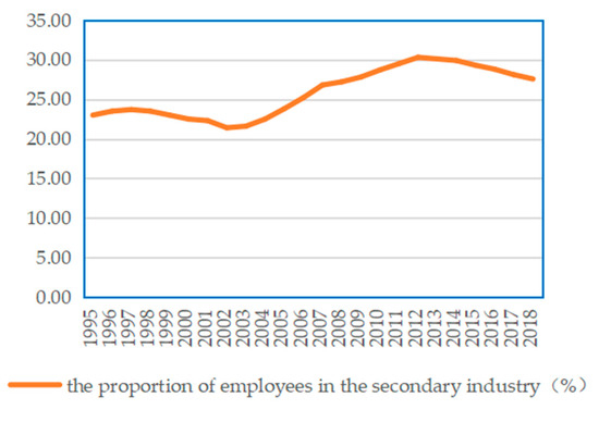 Figure 4 shows the changing trend of the proportion of employees in the secondary industry. From the perspective of population employment structure, the proportion of employees in the second industry increased gradually and maintained a long-term balanced and stable state. After reaching a peak of 232 million in 2012, the number of employed people in China’s secondary industry has been decreasing for six years. The proportion of employees in secondary industry in China gradually decreased from 30.3% in 2012 to 27.57% in 2018. The secondary industry reflects the industrialization degree of a region or country. The higher the proportion of employees is in the industry, the higher the degree of industrialization is.