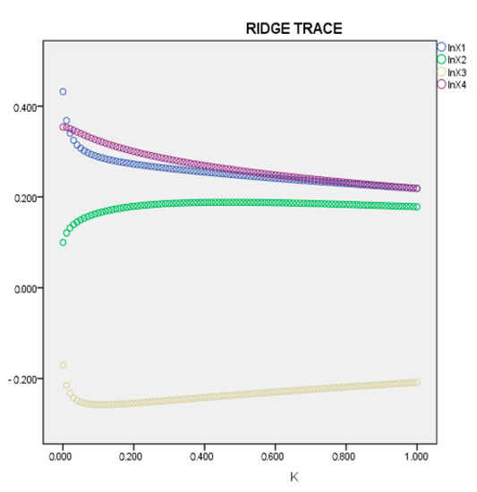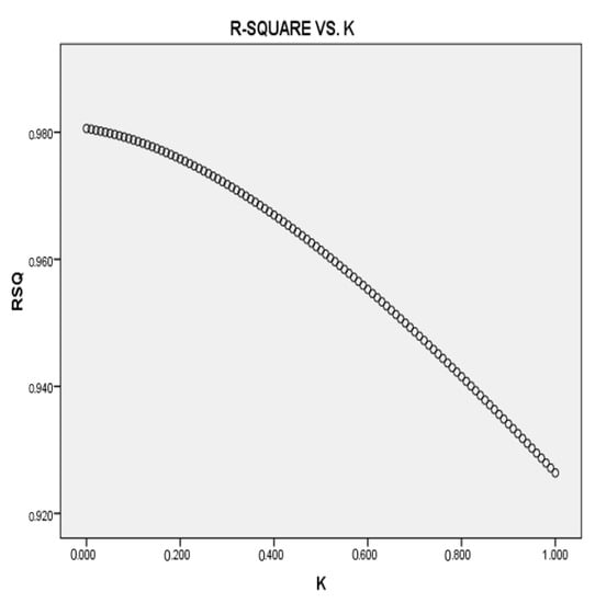 In this paper, the ridge regression method was selected for simulation fitting, which eliminated the influence of multicollinearity to a certain extent. Although ridge regression analysis is a biased estimation method, it does not need to eliminate explanatory variables. It can ensure that the estimator has a small variance and does not make the sum of squares of residuals deviate too much from its minimum value, so as to obtain a more realistic and reliable regression process than the least square estimation [46]. The Ridge regression method is to add K (bias coefficient) to the main diagonal element of the independent variable standardization matrix so that the regression coefficient estimator can maintain a much greater accuracy than the unbiased estimator under the condition of small deviation, which can significantly improve the stability of the estimation [47]. The range of regression coefficient K was set between 0 and 1, and the data interval was 0.01. In this paper, SPSS software is used to analyze the data series and calculated the results in Figure 5 and Figure 6. Figure 5 shows the ridge regression estimation on the model, and the ridge trace diagram. Figure 6 shows the scatter plot of the variation of the resolvable coefficient R2 with the ridge regression coefficient K.