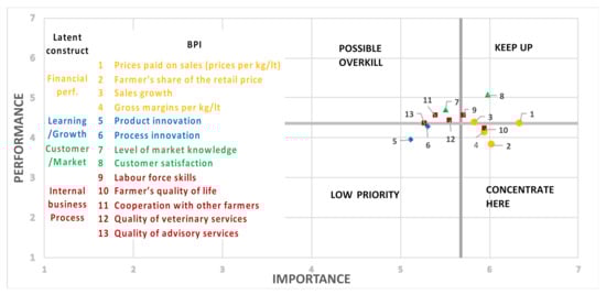 Finally, ‘Low priority’ characterizes most of the indicators in the Learning and growth latent construct. ‘Product innovation’ and ‘Process innovation’ are always classified as ‘Low priority’, with the notable exception of dual-purpose farms that believe they overperform for this BPI.