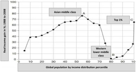 The economic slowdown of Western economies, which started with the Oil Crisis in the 1970s, coincided with the end of the social economic consensus that was achieved after WWII with help of the Marshall Plan. Major changes in the economic system were however initiated somewhat later, firstly in the 1980s in the United States and in Great Britain with the wave of privatizations which accompanied the policies of Reagan and Thatcher, respectively. Following the fall of the Berlin Wall, and the disappearance of ideological competitors to the Western economies, it became politically easier to conduct similar policies in continental Europe, too. Even though the economic mix retained more government ownership and intervention than in the United States, Milanović [1] demonstrated that, in the period from 1988 to 2008, there was hardly any growth of real income of Western middle classes, as evident in Figure 2 (the copyright permission for Figure 2 is available from the Supplementary Materials). When we speak about the role of communities in this process, it appears that the solidarity within Western nations—of the owners of capital with middle and lower classes—was weakened, at the expense of either individualism or merely solidarity with one’s own economic class.