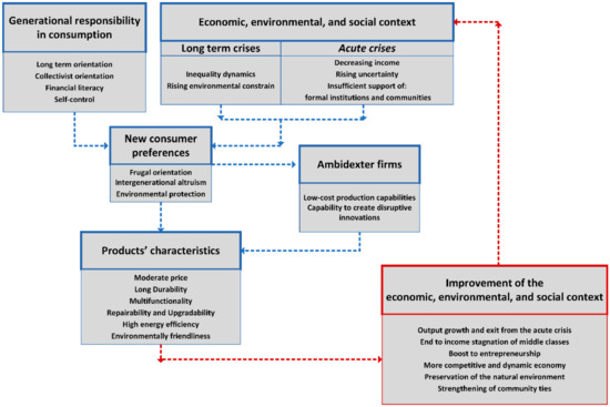 Under these contextual constraints, consumers create a preference toward frugal and environmentally friendly products, and express higher intergenerational altruism. New consumers’ preferences encourage companies to become ambidexter, develop low-cost production capabilities, and create disruptive innovations. Ambidexter firms, both the existing mature ones and those that newly arose, innovate product architecture and are able to develop, design, and launch durable, multifunctional, repairable, and upgradable, energy efficient, green products, with moderate prices. Growing demand for this type of products, a group of value-for-money goods, would help to improve economic, environmental, and social consumption context, resolving acute and long-term crises. The increased demand, motivated by the realization that abstention from consumption could itself produce crises hurting the current and future generations, and companies’ new competitive strategies would boost economic growth and accelerate exit from acute crises. Community ties rebuilt through generationally responsible actions in consumption would create an informal support network and so encourage entrepreneurship, increasing the purchasing power of Western middle classes, and helping the preservation of the natural environment for the future generations. The new improved economic context would lead to generationally responsible consumption preferences that would be willing to pay more for goods of higher quality and prices.
