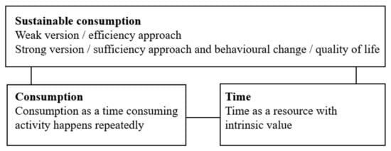 The process started by distinguishing the research question and the theoretical framework, which were modified during the research process until the final version was obtained. Analysis was developed regarding the strong version of sustainable consumption. Time and consumption are the other domains for the developed analysis. In the proposed area, time is a resource with intrinsic value and consumption is a resource-consuming activity. The research question is how time is conceptualized and used in sustainable consumption. The theoretical framework and connection of the concepts are summarized in Figure 1.