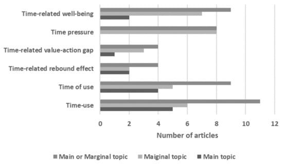 In the reviewed literature, time is mostly noted for its allocation to consumption activities. In almost all the defined categories, debates are developed based on the use of time and time-consuming nature of the activities. Practice theories and the explanation that experiences of time are experiences of practices [23], describe the main theory for time debates in these articles. Some have discussed time-use as the main time related issue [14,19,20,26,28], and some have involved this category in marginal arguments [13,15,17,18,27,30]. The time of use and patterns of activities also have appeared as the main topic [13,14,15,19] as well as the marginal one [20,26,27,28]. The non-intended result of the time saving or the “time related rebound effect” was mainly discussed by Buhl et al. [17], Buhl and Acosta [18], and Jalas [19]. Smetschka et al. [14] have discussed this category as a marginal topic. The time-related value-action gap as the subject is discussed by Chai et al. [27]. However, some other authors also have provided marginal arguments on that [15,20,29]. Although time pressure has not been the main subject in any of the reviewed articles, the authors were concerned about its role in consumption [13,14,18,20,26,27,28,29]. Hansen [29] and Pullinger [30] were focused on time-related well-being. The significance of time from this point of view also appeared in other articles [14,17,18,19,20,27,28]. Frequency of categories in the analyzed articles is shown in Figure 2.