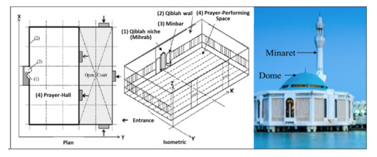 Figure 1 presented the architectural elements of a typical mosque building. Mosques are usually built in simple rectangular forms with large praying halls. The halls are usually open plan with high ceilings and sometimes small, enclosed rooms are attached to the halls. In each mosque, one of the longest sides of the rectangular form is called the qibla wall and it must be oriented towards the direction of Al-Ka’abah in Makkah city [8,9,10,11,12,13].