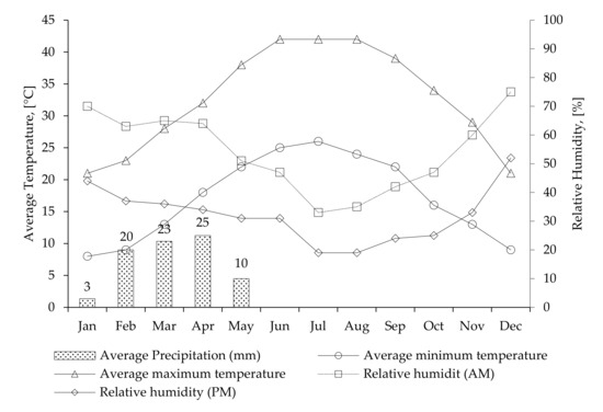 According to the Koppen–Geiger climate classification, Riyadh is located in a hot arid desert climate zone. In general, it is possible to distinguish two climatic seasons in Riyadh. The period from April to October forms the hot dry season, whereas the remaining months form the relatively cooler season. As observed in Figure 2, the mean maximum air temperature in the former season extends between 32 °C and 42 °C and the mean minimum air temperature extends between 16 °C and 26 °C. Likewise, the mean maximum and minimum air temperatures in the cooler season are 21–29 °C and 8–13 °C, respectively. The relative humidity ranges are 33–64% and 60–75% in the morning for the hot and cooler seasons, respectively. For the afternoon relative humidity, the corresponding ranges are 19–34% and 33–52%. The rainy period extends from January to May with a maximum of 25 mm in April.