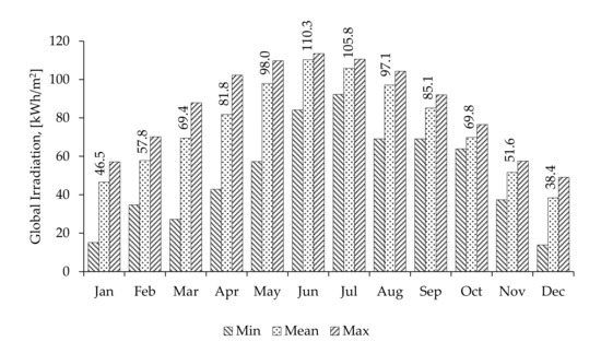 Figure 2 shows the average precipitation, mean minimum and maximum air temperatures, and morning and afternoon relative humidity in Riyadh. Additionally, the mean, minimum, and maximum solar irradiation levels are presented in Figure 3. The mean global irradiation extends between 70 kWh/m2 and 110 kWh/m2 during the hot dry season and between 38 kWh/m2 and 69 kWh/m2 during the cooler season. In the former season, the maximum and minimum global irradiation ranges are 92–113 kWh/m2 and 43–77 kWh/m2, respectively. The corresponding ranges in the latter season are 37–88 kWh/m2 and 14–49 kWh/m2. It is worth mentioning that Saudi Arabia is located within a sunbelt region [25].