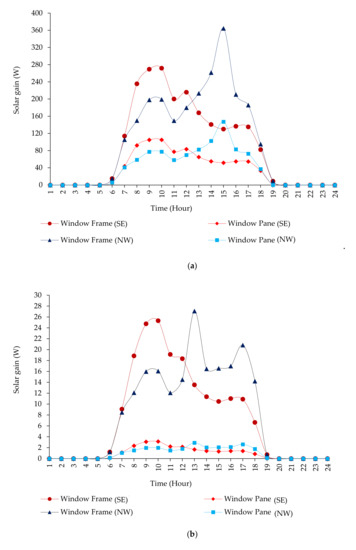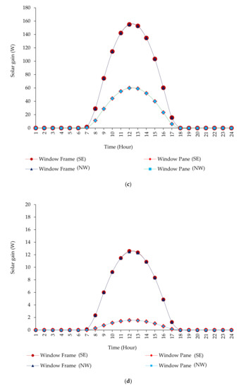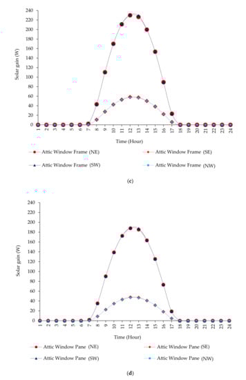 Solar gain of the attic windows’: (a) frames on 22 June, (b) panes on 22 June, (c) frames on 22 December, and (d) panes on 22 December.