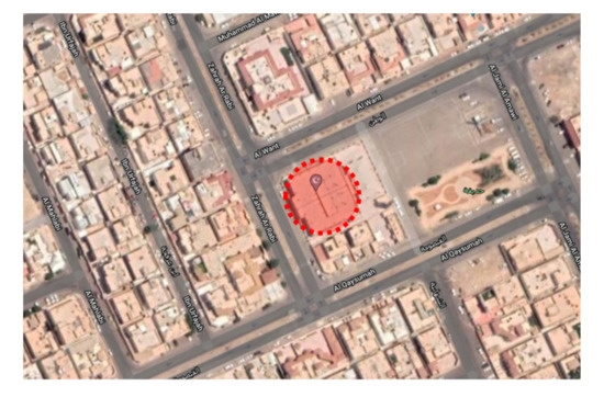 The prayer hall is designed to satisfy the requirements of the Muslims’ prayer [9,11]. The prayer involves some physical actions like standing, bowing, prostrating, and sitting [7,8,9,10,11]. In addition, the worshippers should stand facing qibla (the Makkah city direction) in straight parallel rows that are 1.2 m roughly in width. A special prayer is performed on Friday, in which the worshippers sit to listen to a speech (Khutbah) from the leader of the congregation (Imam) who stands on the pulpit (minbar). Accordingly, the required area per worshipper is estimated as 0.8 × 1.2 = 0.96 m2 [11]. It is worth mentioning that not all mosques are used for Friday prayers.