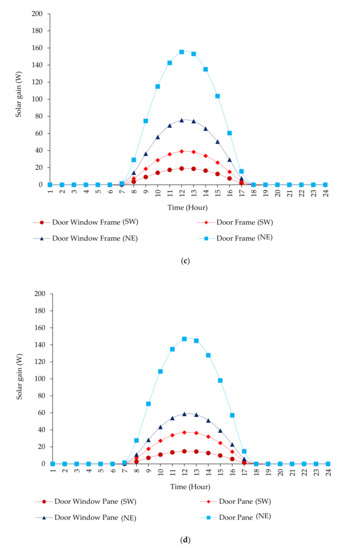 Solar gain of doors’ and doors windows’: (a) frames on 22 June, (b) panes on 22 June, (c) frames on 22 December, and (d) panes on 22 December.