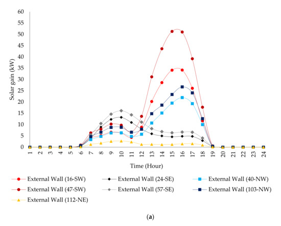 Figure 9 presents the solar gains of the external walls. A discrepancy between the summer and winter gains can be noticed, as the maximum gains were above 50 kW and below 10 kW, respectively. During summer, the solar gains’ pattern responded to the influence of the walls’ orientation. For instance, the eastern walls increased gradually during the morning, reached a maximum gain at 10:00, and then started decreasing. The western walls’ gains increased gradually until 9:00, decreased until 11:00, and increased again sharply reaching the maximum gains between 15:00 and 16:00. As expected, the gains of south-western walls were much higher than those of the north-western walls, which may be attributed to the shade from the eastern tents and the surrounding buildings.