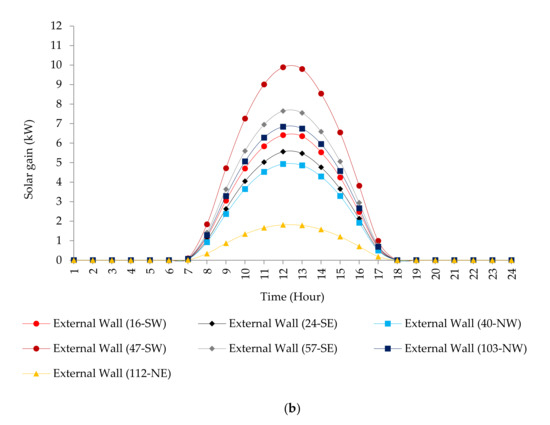 Solar gain of the external walls on: (a) 22 June and (b) 22 December.