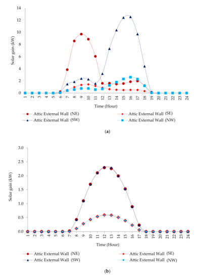 Solar gain of the attic walls on: (a) 22 June and (b) 22 December.