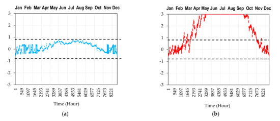 Relaxing the comfort zone to extend between (−0.80) to (+0.80) revealed comfortable indoor conditions throughout the year in both Prince Sultan and Al-Sheikh Ishaq Al-Hajri mosques under the controlled mode. In Al-Hassan Ibn Ali mosque, the conditions were comfortable in the period from October to April. Obviously, none of the mosques were fully within this relaxed zone in the free running mode. However, the conditions of three months, namely December to February, were comfortable in both Prince Sultan and Al-Hassan Ibn Ali mosques. For Al-Sheikh Ishaq Al-Hajri, the comfortable conditions included the previous period in addition to November and March, which may indicate the integrating of comparatively better passive strategies in this mosque.