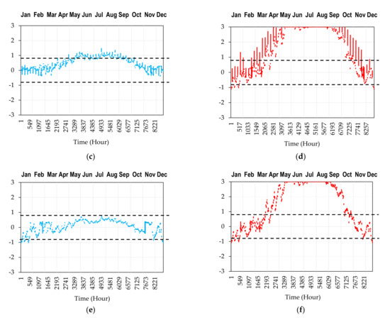 Hourly PMV in: (a) Prince Sultan mosque (Controlled), (b) Prince Sultan mosque (free-running), (c) Al-Hassan Ibn Ali mosque (Controlled), (d) Al-Hassan Ibn Ali mosque (free-running), (e) Al-Sheikh Ishaq Al-Hajri mosque (Controlled), and (f) Al-Sheikh Ishaq Al-Hajri mosque (free-running).
