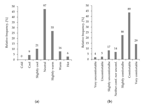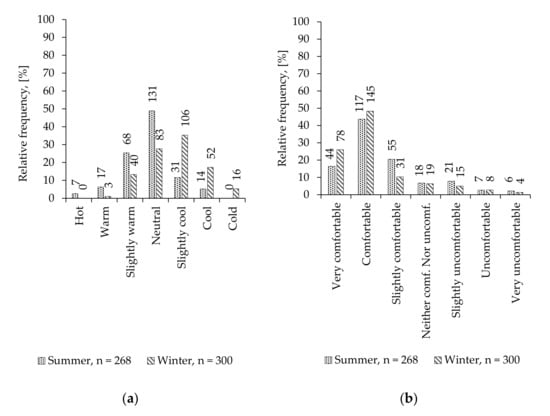 Participants’ actual thermal votes of: (a) sensation and (b) comfort (labels are number of participants).