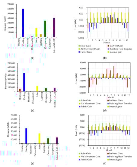 Figure 16 presents the annual loads of the investigated mosques in nine categories, namely heating, cooling, humidifying, dehumidifying, solar, lighting, occupants, equipment, and internal loads. In addition, the figure displays the monthly breakdown of the loads. It is worth mentioning that fabric gain combines the eternal opaque conduction with external transparent conduction loads. Likewise, the internal gain combines the occupant, equipment, and internal loads.