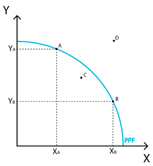 The underlying assumption of production and consumption decisions is premised on neoclassical consumer theory, which defines individuals in an economy as having insatiable desires to consume. This assumption is reflected in the production possibilities frontier (PPF) where efficiency is defined as any production combination found on the PPF line (Figure 1). On this line, the economy is maximizing production relative to resource constraints. Combinations of output along this can only be attained by allocating the resources in a way that maximizes production relative to inputs (e.g., land, labor, and capital). Depending on whether the allocation of resources considers intergenerational equity and renewability of resources, these trade-off decisions may or may not be consistent with sustainable resource utilization.