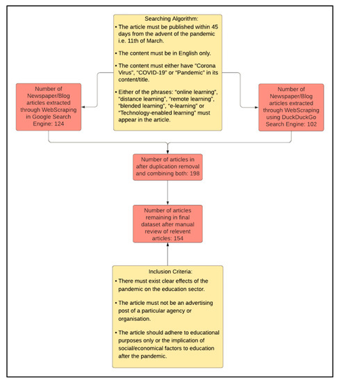 In this study, we selected two widely used search engines, Google (https://www.google.com/) (accessed on 11 March 2020). And DuckDuckGo (https://duckduckgo.com/) (accessed on 11 March 2020). For Google, we extracted the required online news articles and blogs using the Advanced Search Option offered by Google Search Engine after clearing cache and removing location settings to avoid algorithm’s impact on the results. We extracted the required dataset for 45 days starting from 11 March 2020, when the World Health Organization (WHO) declared Coronavirus disease a pandemic. We searched Google using the syntax combination: “COVID-19” OR “Coronavirus” OR “pandemic” “(“online learning”|“remote learning”|“distance learning”|“blended learning”|“e-learning”|“Technology-enabled learning”)” when: 45 days (see Figure 2).