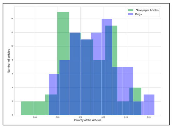 There was a significant difference between mean polarity scores of the news articles (M = 0.11, SD = 0.06) compared to the blogs (M = 0.13, SD = 0.05); [t (152) = 2.61, p < 0.05] (see Table 4). The calculated effect size (Cohen’s d) is 0.42, which is considered a large effect [53]. Figure 4 shows the polarity pattern for the news and blogs. The histogram for blogs is shifted towards the right than the news articles. This result indicated that people’s opinion in blogs are more positive as compared to the news articles. In general, we can conclude that people have positive sentiments towards online learning.