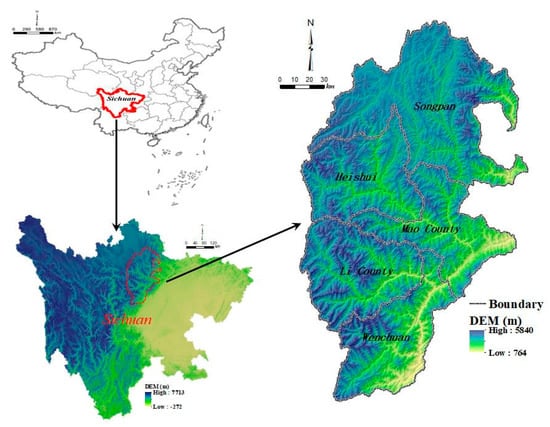 The upper reaches of the Minjiang River (Figure 1) are located in the northwest of Sichuan, connecting the Chengdu Plain and the Qinghai Tibet Plateau. It is not only a transitional zone between Han and Tibet but also an important transportation corridor and hub between Sichuan and Tibet. The terrain inclines from northwest to southeast, and the relative height of the ridges and valleys is 1500–3000 m. The highest elevation in the area is Mount Siguniang (6250 m); the lowest the southeastern Xuankou area (780 m). The geological structure of this area—which mainly developed as a result of its position on the Longmen Mountains NE, Barkam NW, and Minjiang NS tectonic—is complex and consists of a large number of folds and faults. Through internal and external forces and extreme weather, geological hazards are easily induced [25]. The upper reaches of the Minjiang River, in the region of a plateau-type monsoon climate, have obvious dry and wet seasons, large daily temperature differences, and small annual temperature differences. Under the combined influence of atmospheric circulation and alpine gorge topography, this area exhibits dual characteristics (horizontal and vertical zonality) [26]. Soil with high-erosion intensity and serious degradation significantly restricts developments in agriculture [27].