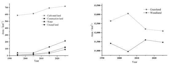 It can be seen from the figure that grassland and woodland are the dominant patches in the study area, and they are widely distributed. Cultivated land is mainly scattered along the river. Further analysis (Figure 3) showed that grassland decreased at the rate of 18.44 sq km per year, and the reduced grassland was converted into other types of land. The average growth rate of the water system was 5.81 sq km per year, and the increased amount was 174.45 sq km; the growth rate of the forest land was the slowest, which was 1.94 sq km per year. Cultivated land was the third-largest component of the study area, and its growth rate was next only to forest land, which was 4.40 sq km per year.