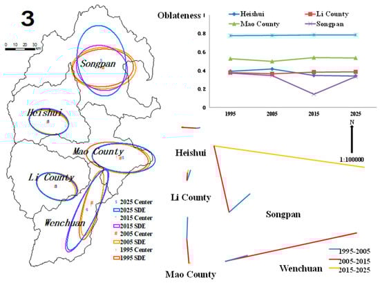 From the trajectory of the gravity center (Figure 5), Songpan has changed the most, followed by Wenchuan and Mao County. Heishui and Li County have changed little. From 1995 to 2005, the center of gravity of cultivated land in Songpan moved 2.58 km to the northeast. By 2015, its center of gravity had moved 6.2 km to the northwest. After 2015, its center of gravity moved westward, and its moving distance reached 13.96 km. On the whole, the gravity center of cultivated land in Songpan moved to the northeast, and the moving rate is increasing year on year. The change in the cultivated land gravity center in Wenchuan is second only to Songpan, and the whole is moving to the northeast. The center of gravity of cultivated land in Wenchuan moved westward from 1995 to 2005, with a moving distance of 2.15 km. From 2005 to 2015, the center of gravity of cultivated land changed greatly, moving eastward by 12.4 km, and the moving rate was six times that of the previous 10 years. After 2015, the transfer rate of the cultivated land gravity center in Wenchuan slowed down, only moving 1.6 km to the west. The center of gravity of cultivated land in Mao County moved southward as a whole. As a whole, the change in the cultivated land gravity center in Li County and Heishui was the smallest. The gravity center of the cultivated land in Li County moved southward from 1995 to 2005, at a relatively fast speed of 1.01 km in 10 years. After 2005, it moved northward and the speed was slow. It moved 0.72 km between 2005 and 2015, and only 0.31 km between 2015 and 2025. On the whole, after 2025, the cultivated land gravity center of Li County will move in the same direction as 1995, and the two are not far apart. Although the center of gravity of Heishui has not changed as much as that of Li County, Heishui is moving westward as a whole.