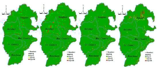 (2) In Songpan, Type I decreased slowly, and the decreasing speed was increasing year on year. The area base of Type II and Type III is small, but the highest growth rate is four and five times that of the previous period, respectively. In recent years, the focus of the government work mainly lies in the solid promotion of major ecological-protection projects, such as the construction of the “Baili Shan Gallery,” comprehensive management of the Minjiang River Basin, large-scale greening of the whole county, and strengthening the protection and construction of the Minjiang River source, the National Wetland Park. Songpan is striving for the goal of a “plateau ecological home, international tourist resort.” Under these measures, a large number of limited cultivated lands are being converted into other land types, thus aggravating the human–land contradiction.