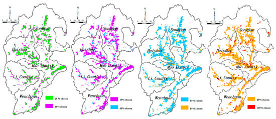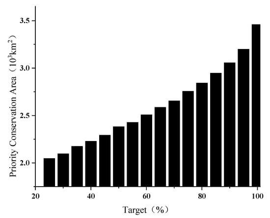 Until now, the conservation targets for cultivated land have not been clear in the upper reaches of the Min River. In this study, different percentages of a cultivated land area in the whole basin were selected as the potential protection objectives of the priority-protection planning of cultivated land, based on the minimum demand of cultivated land when k = 0.28. The spatial priority of cultivated land in the watershed, from 25% to 100% of the total (Figure A2, see Appendix A), was simulated. The determined objectives reflect the spatial characteristics of priority-protected areas, especially to bring more suitable cultivated land into the basin-protection network. The selected target can also be used as a protection threshold to prevent fragmenting cultivated land and to ensure its high compactness. The priority conservation areas identified for cultivated land under different percentages of the total amount of cultivated land area (25% to 100%) (Figure 7) ranged from 57.37% to 96.97% of the landscape area with the boundary length effect. The number of conservation area patches increased as conservation targets increased from 2.05 × 103 km2 to 3.46 × 103 km2 target levels, and as the priority conservation areas for cultivated land became more extensive; the height also increased.