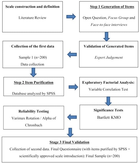 In different investigations, it can be seen that the construction of a measuring scale is carried out using a step procedure. The following three basic steps are frequent: the generation of items; the purification of the generated items; and the evaluation of the reliability and reliability of the measurement scale construction [42,43,44]. For DeVellis [42], after generating the items, the purity of the generated items is evaluated, which ensures that to test the scale validation it is necessary the evaluation of other experts, usually using expert judgment as a method, and also when testing through the target audience to be reached, being possible through the elaboration and evaluation of questionnaires. For the authors, the third and last step refers to psychometric analysis. The researcher must test if the scale has validation and construction reliability. Churchill [45] states that this is the fundamental step to know if the content of the study is really measured. It is at this stage that specialized programs for statistical analysis are introduced, such as IBM SPSS and SmartPLS 3, which are used in this study. Through IBM SPSS the validity construction is ensured through the exploratory factor analysis, called Exploratory factor analysis (EFA), and through SmartPLS 3, the confirmatory factor analysis, (CFA)—Confirmatory factor analysis. Reliability is measured with the consistency of each item score. These tests are guaranteed by representative samples [42].