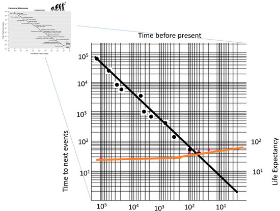 Time between major revolutions is shrinking exponentially. On a logarithmic scale, the ratio between ‘the time to next paradigm shift’ and between ‘time before present’ is about 1:1 [7], while life expectancy worldwide went from approximately 35 years old in 1920, to 46 in 1950, to about 70 in 2010 [8,9,10]. The figure below (Figure 1) is a simplistic, schematic graph, suggesting that somewhere around 1970–1980 the two lines crossed, meaning that after that point in time, throughout one’s lifetime there was more than one major technological paradigm shift, and that since about 10 years ago, one would experience multiple paradigms shifts during their life-time, leaving practically no time for society to adjust. For example, researchers identify six (6) major technological paradigms developed between 1990 and today, just in personal computing devices [11].