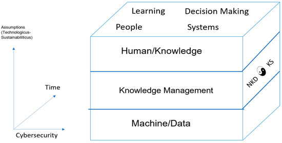 An illustration of this model can be seen for example in the information support of web community users’ personal verification systems, proposed by Korobiichuk et al. [84]. The proposal incorporates the user and their knowledge at the knowledge/human layer with the data and the verification system (including the cybersecurity aspects listed below in Section 2.2.6) at the data/digital machine layer, for the purpose of knowledge sharing by a web community, at the knowledge sharing layer.