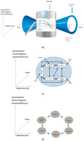 The truth of the matter is that one aspect is mostly missing from these models and must be explicitly added to the proposed framework, thus adding another element, time (see Figure 4b). Again, and again, while teaching KM classes, consulting with clients, researching and reading other practitioner and academic research, the author was confounded by the failures of all the practitioners, politicians, and academic actors to understand the importance of time and its complexities for strategic decision-making, managing knowledge or human capital, among many other aspects. Time is one of the hidden assumptions (dimensions) continually used without giving it a second thought. In practice, the misalignment of time horizons (present and future) and time frames of events constitutes an enormous impediment (both in planning/formulating and in implementation), but is rarely explicitly identified as an issue and/or studied (see a rare, very recent exception in Myllykoski [99]).
