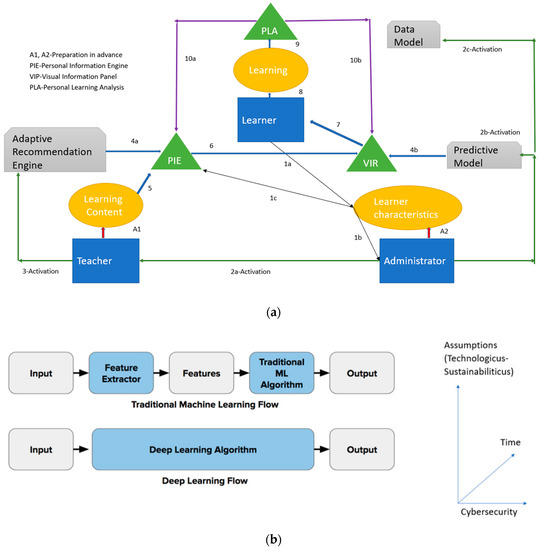 Machine learning is a sub-field of artificial intelligence, and its structure mimics the neural network within the human brain. Machine learning models require human intervention to segment (label) data into categories in preparation for the process of training, which enables faster training, and is known as supervised learning. There are three types of learning tasks: Supervised learning, unsupervised learning, and reinforcement learning (see for example [133]). Deep learning is a sub-field of machine learning, and its digital neural networks are structured based on layers of models, which can decode patterns within a given dataset. As such, deep learning algorithms do not require prior human intervention to segment data into categories, since it can leverage unsupervised learning to train itself. Early models of deep learning required high volume of training data to learn efficiently, while the more recent models can use a smaller data set [134]. The discussion above is summarized and modeled in Figure 6a,b).