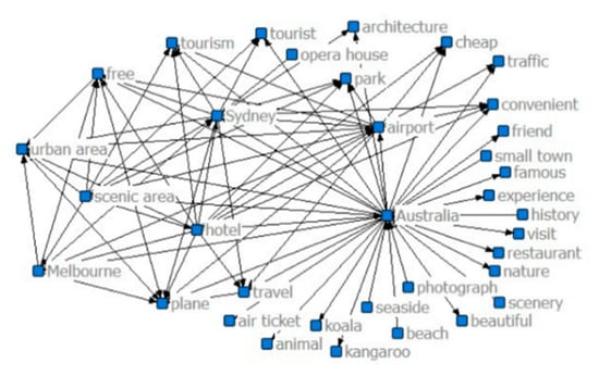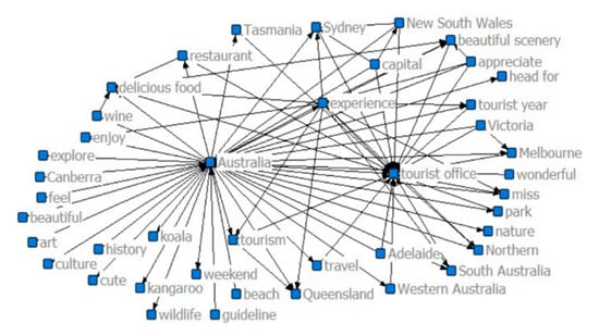 In the current study, the “social network and semantic network analysis” function of ROST CM6 software was used to analyze TGC and NTO textual data, so as to visually reveal the perceived and the projected cognitive destination image of Australia. Semantic network analysis, an effective method for text analysis, is often adopted to construct a network map reflecting the psychological cognition of text publishers through the connections between words, which can reveal the semantic core and internal structure of the text [61]. The nodes in the semantic network diagram represent frequently appearing keywords, and the lines between nodes represent the connections between frequently appearing keywords.