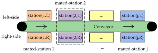 The two-sided disassembly line is to arrange the workstations on the two sides of the conveyor to form two independent working areas. As shown in Figure 1, each station is equipped with operators, fixtures and disassembly tools; the EOL product is distributed to the left (L) or right (R) side of the disassembly line, and is broken down into the required parts on each workstation. Two workstations directly facing each other is called a mated-station, the station (2, L) and (2, R) together constitute the mated-station 2, station (2, L) can be called the companion station of the station (2, R), and vice versa [7,31].