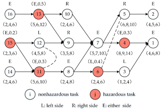 Figure 2 shows a two-sided disassembly problem with 16 tasks (P16) modified from the assembly line problem [32]. Each circle indicates a task, and the letters (L/R/E) above the circle represent the side of the task that can be arranged; tasks with L indicate that those tasks can only be dismantled on the left station of the disassembly line, and R on the right, tasks with E imply that they can be disassembled on the left as well as on the right of the line [7,9]. The real number between 0 and 1 in brackets above denotes the hazard degree of the task: the larger, the higher the danger degree is, and the more serious the environmental pollution generated. It should be noted that if the hazard degree of a task is 0, it is not identified in Figure 2. The triple array below the task represents the fuzzy disassembly time of the task, which will be introduced in Section 2.3.