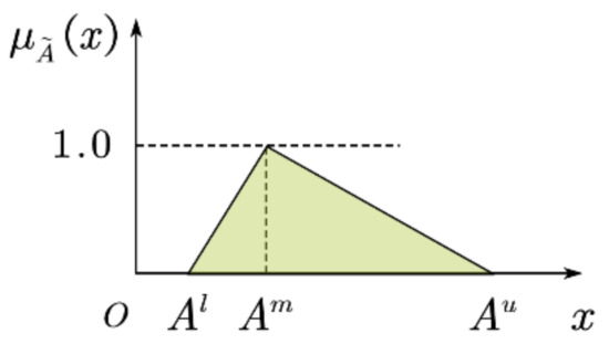The symbol in Equation (2) represents the parameter at this position, taking the maximum value between and 0. Meanwhile, in order to compare the size of a group of fuzzy numbers, a popular defuzzification technique is adopted to convert fuzzy numbers into crisp real numbers [30,33], the defuzzification method can be computed by Equation (5). Notation indicates the maximum possible real number of .
